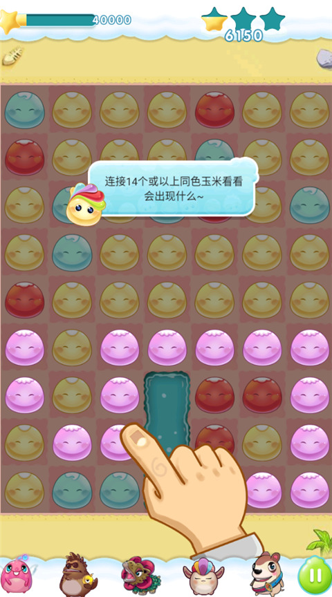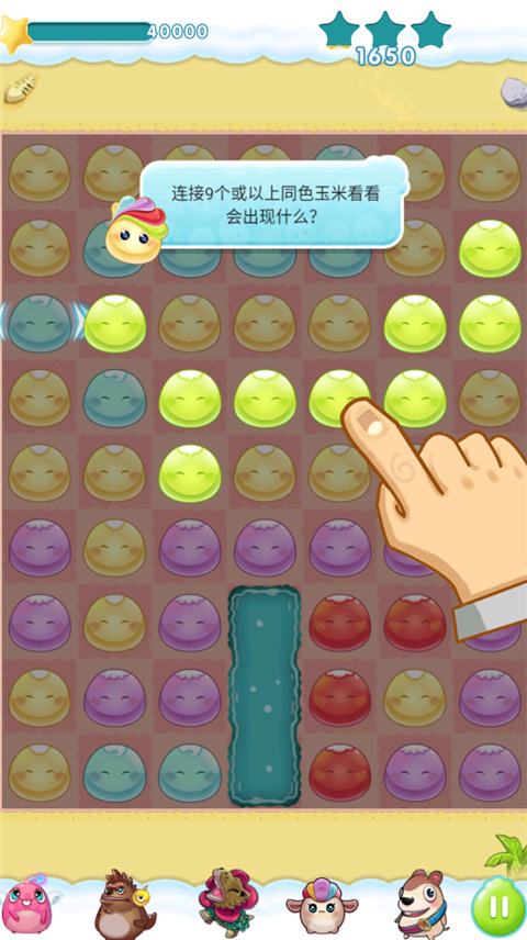 同色相邻的玉米必须至少三个才能连接成一条线爆破掉。
