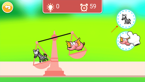 第一个游戏通过的技巧就是判断两个称上的小动物哪个比较重,判断出来后只要点击右边重的小动物就可以通关了。