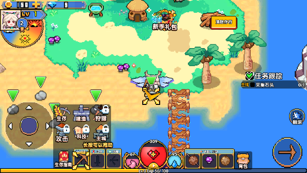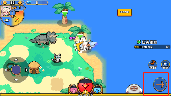 收集木头,走到椰子树旁边,点击右下角的箭头,就可以采集到木头和鲜甜的椰子。