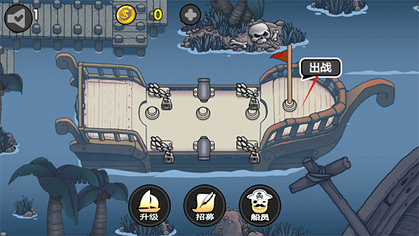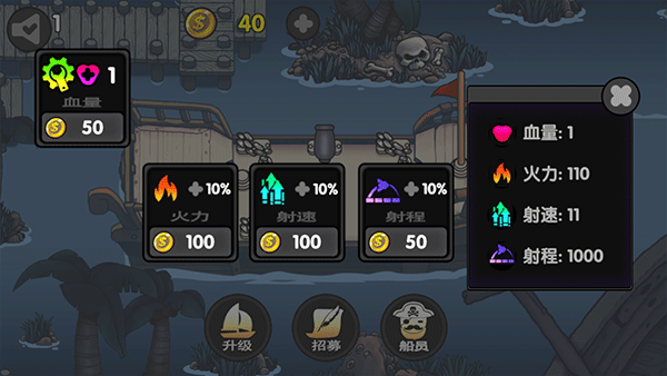 在航海赏金猎人游戏中除了战斗和招募船员以外,玩家还需要为船升级火力、射速、射程、血量等属性来提升战斗力,战胜更多敌人