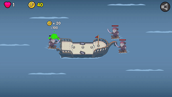当敌人出现在船的攻击范围内后就会自动发起进攻,每击败一个敌人就能获得金币奖励
