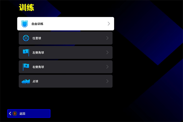 新手玩家对游戏不熟悉,可以点击“额外选项”,再点击“训练”,可以进行自由训练、任意球训练、左侧角球训练、右侧角角球以及点球训练
