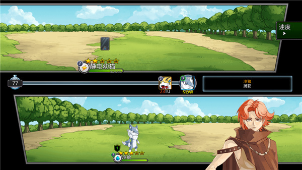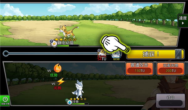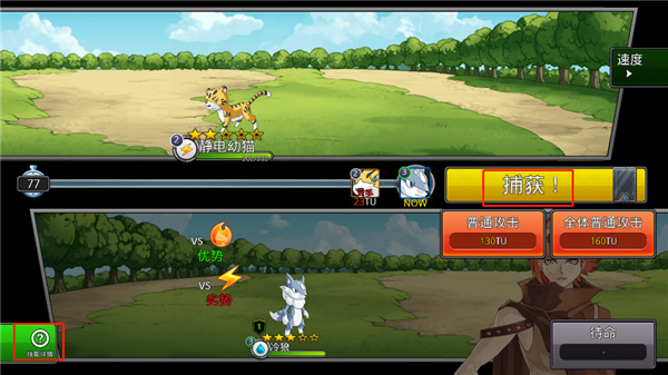 继续根据主线,来到森林,碰到静电幼猫的话,点击捕获开启捕获,如果玩家不知道自己搭档怪兽的技能的话,可以点击右下角的技能详情,了解它的基本技能;