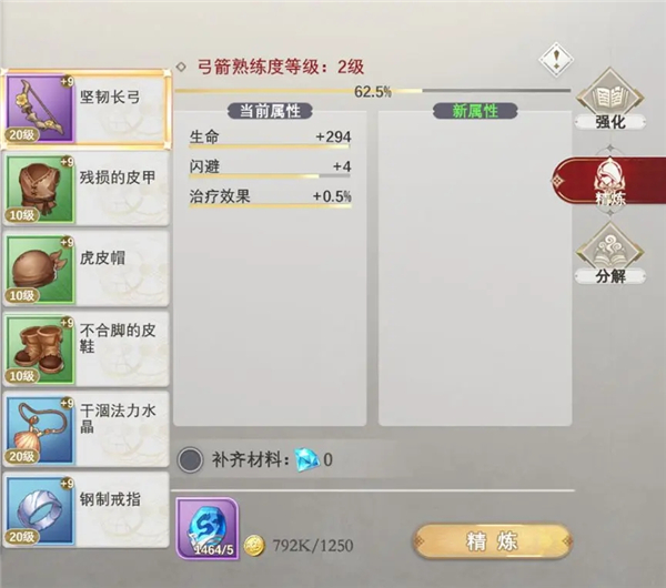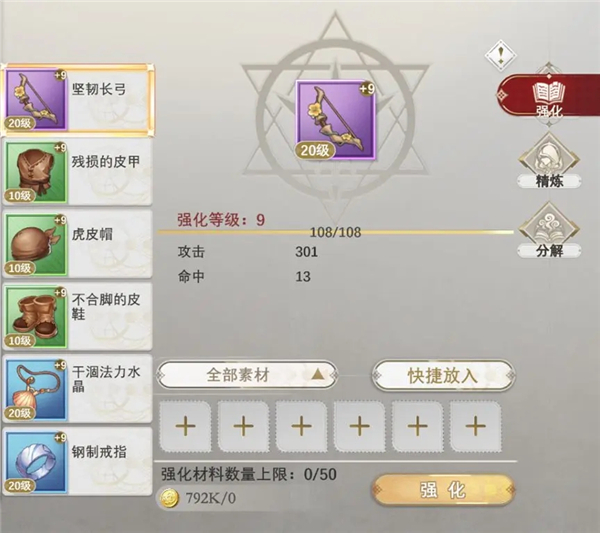 铁匠铺培养装备;每个英雄都有6个可强化部位,强化可以提高装备现有数值,最高可强化+9,另外强化过的道具也是可以作为更高阶的装备的强化材料哦,所以不要担心装备强化损失;装备精炼可以洗练出不同属性的词条,玩家可以根据英雄特性来决定最优选择。