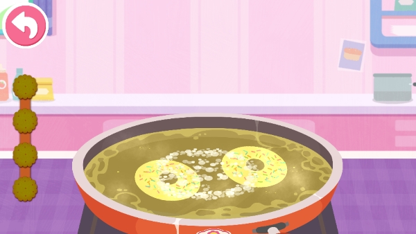 将成型的甜甜圈放入炸锅至两面金黄用铲子捞出。