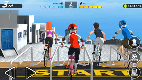 游戏玩法:玩法方面还是属于比较简单的,只需简单掌握左侧的控制,右侧的加速、刹车和跳跃键即可,避免与障碍或者其他选手发生碰撞,这样会造成减速,同时在踏板跳跃时多次点击方向键可以更有利于速度的提升,直至到最终最先抵达终点的选手获胜。