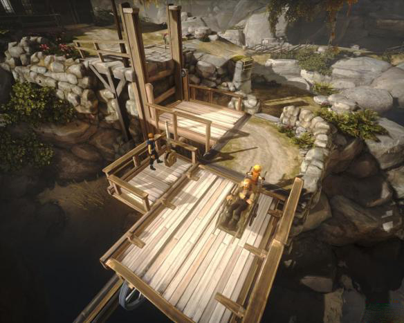 游戏开始后,沿着路往桥的方向走,会有一个简单的解谜,这里弟弟的力气不够,需要用哥哥来扳动把手,过桥往右边走,到一个断掉的下,需要哥哥把弟弟抬上去,弟弟再去吧旁边的绳子放下,让哥哥上来,之后一起去扳动升降机边的把手。(两人一起)