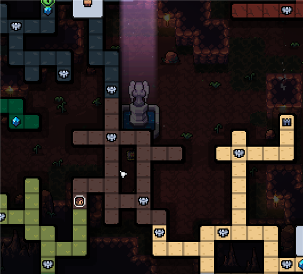击杀史莱姆后拿深绿武器基本上都能清完洞穴图,有一个有绿色眼睛的房间是召唤国王用的,暂时进不去,第二个镇子连接着地洞,这个地洞难度最低,顺手清了,商店和徽章买一买,把之前跳过的地洞都清一下,然后出发去火山。
