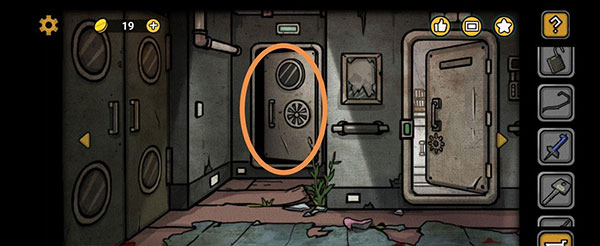 通过通道口,在楼梯的正下方发现一个螺丝刀柄。然后右转,在麻袋中取得配电室钥匙。