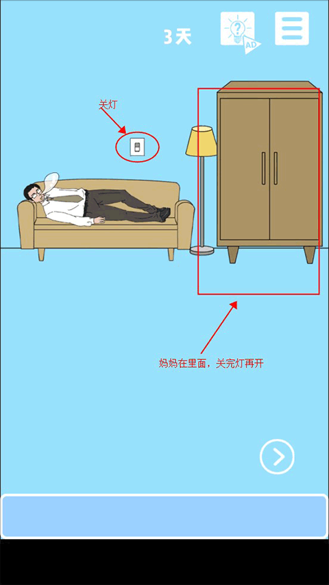 回到左边,我们先关灯,等灯关了打开柜子,妈妈在柜子里,我们现在全身都是黑的,打开柜门后妈妈会被吓晕,我们就能顺利的拿到泡面啦。