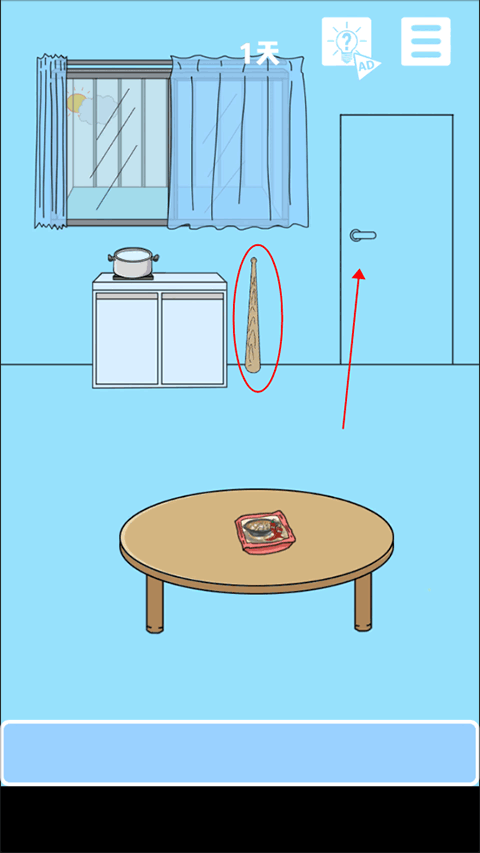 我们先看第一关,在关卡里有一个很突兀的棒球棍,我们可以先点击这个棍子,获得棍子后把棍子移动到门口,把门堵住,再把泡面放进锅里就过关了。