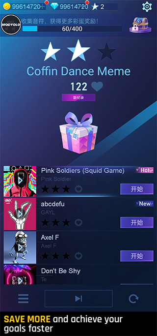 选择你喜欢的音乐点击进入游戏,每个音乐节奏都有所不同,难度也有所不同;