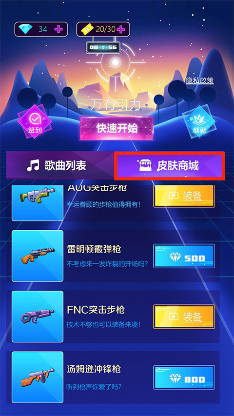 在【皮肤商城】界面还有各种各样精美的限定皮肤可以解锁使用,以上就是子弹节奏2的玩法了。