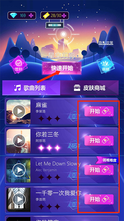 打开子弹节奏2手机版,进入游戏主界面,在歌曲列表中选择喜欢的歌曲点击【开始】选项,也可以选择快速开始挑战随机歌曲,