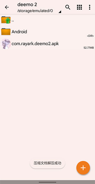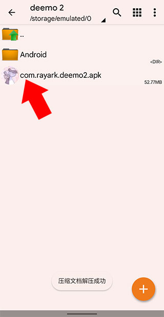 使用ZArchiver打开zip压缩包,并将Android文件夹与.apk文件解压至新建的deemo2文件夹中