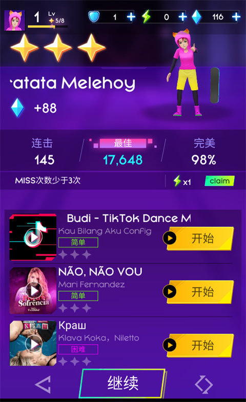 选择好难度后即可选择音乐,点击开始即可开始闯关;