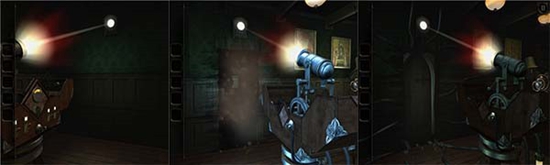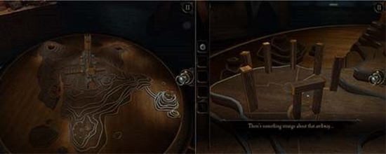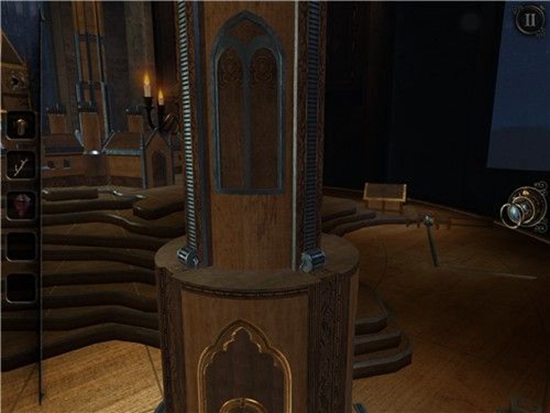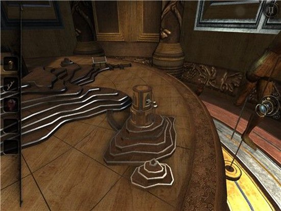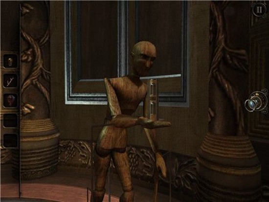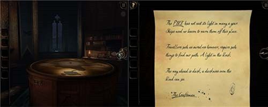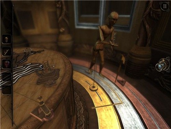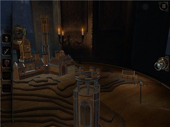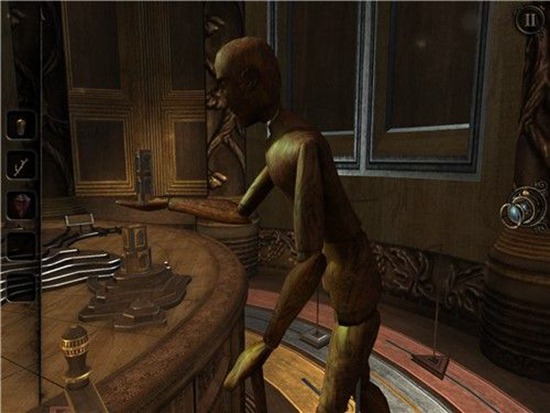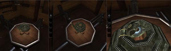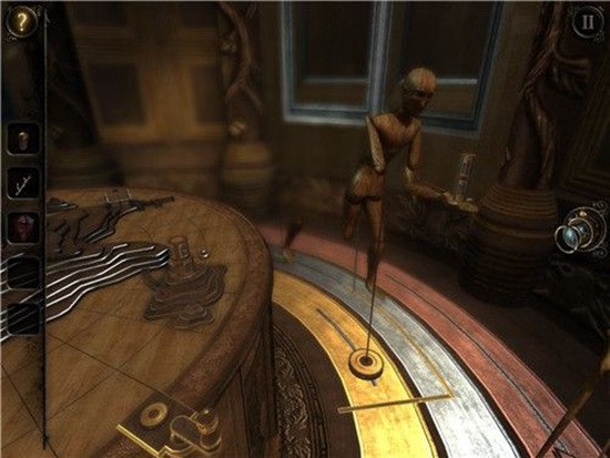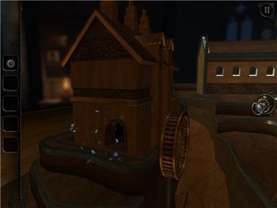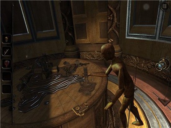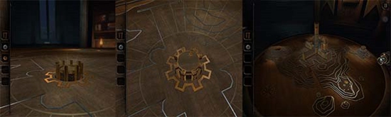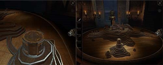 本处需要多次转动沙盘下方的把手,依次把木偶人的双手和脚拼上,每装上一个部件,就会触发一次沙盘上的建筑物机关,需要用透视镜进入该机关。
