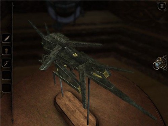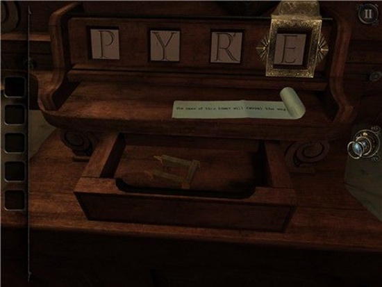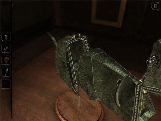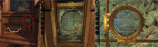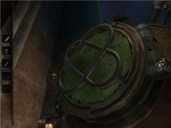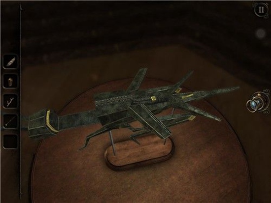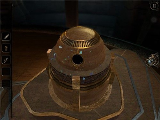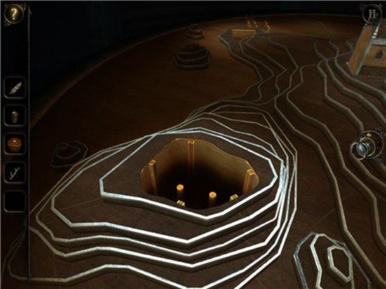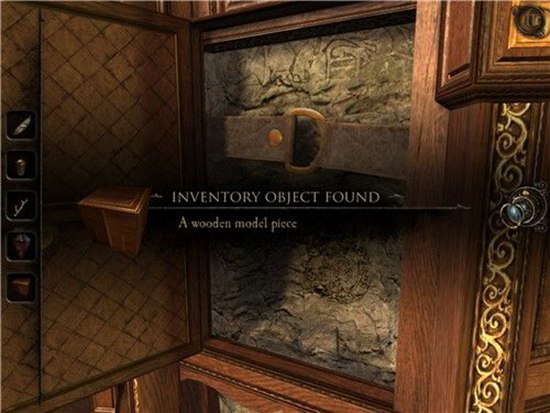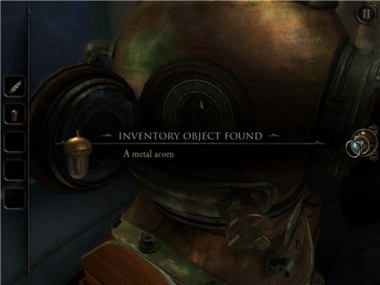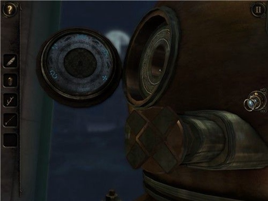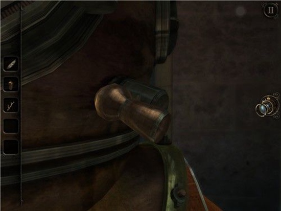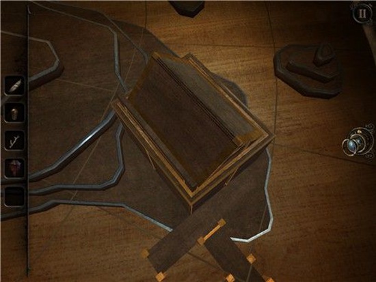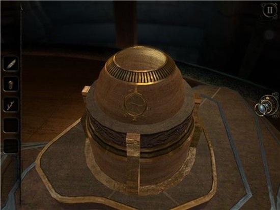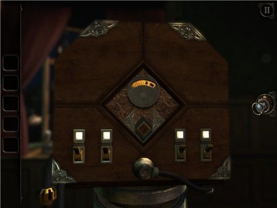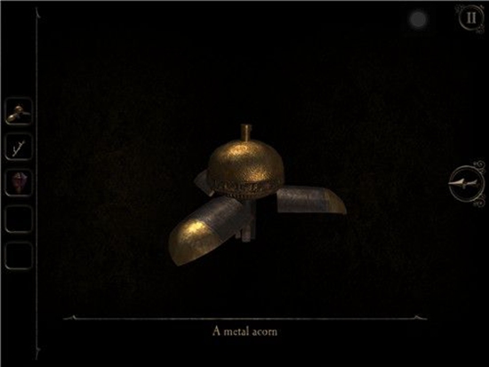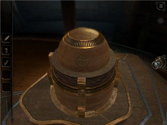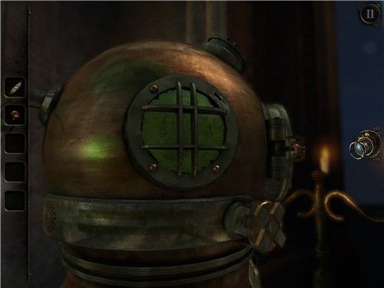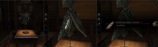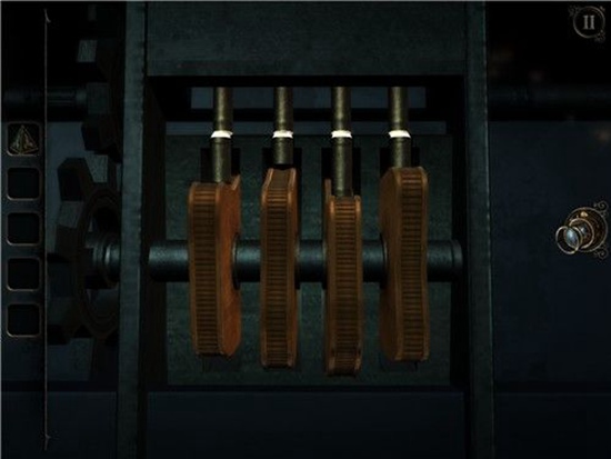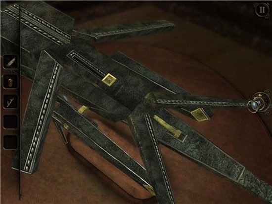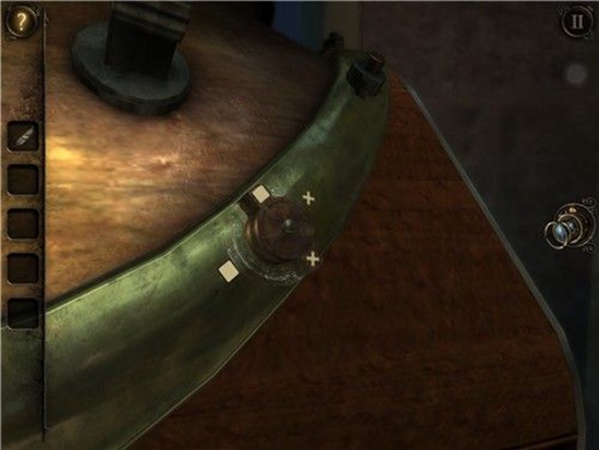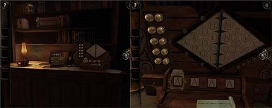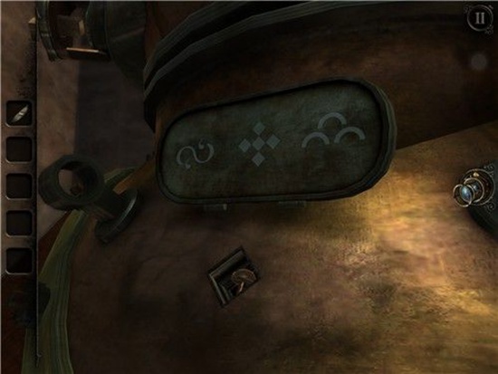 退回到房间里,发现沙盘后面的桌子上有一个头盔形状物体,仔细观察发现左下有一处按钮,有明显划痕,把X和方块扭到对应位置,即可打开头盔铭牌下的机关,得到一个黄铜铆钉。
