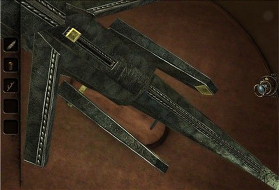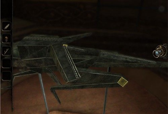 里面是一个机关猫头鹰,把鼻子往上提,转动头部,胸部一侧会打开,沿着轨道拉动机关,翅膀会打开,拿到小船。退回沙盘。