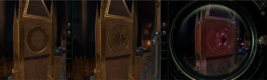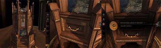 沙盘上的钟楼没有钟面,从背包中拿出放上去,打开钟面,透过透视镜进入。