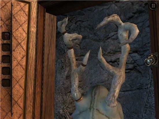 我们发现鹿角有几个部位有金属圈,可以滑动,把左边调整成与右边一致。打开上方的石头机关。