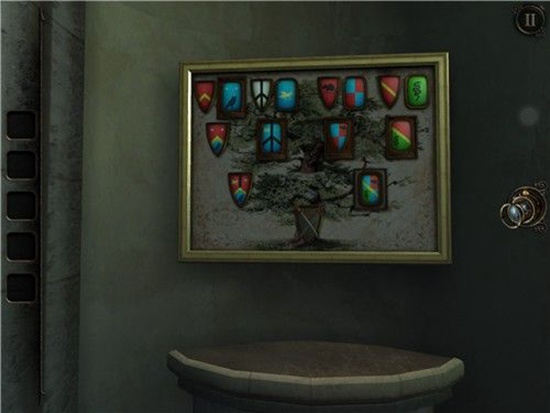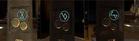 来到大厅一个存放很多徽记的墙面处,将徽章放在第三排凹槽处。其余4个徽章会浮现出来。