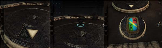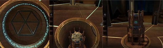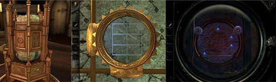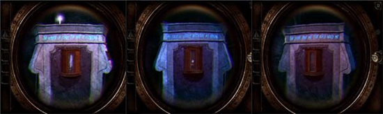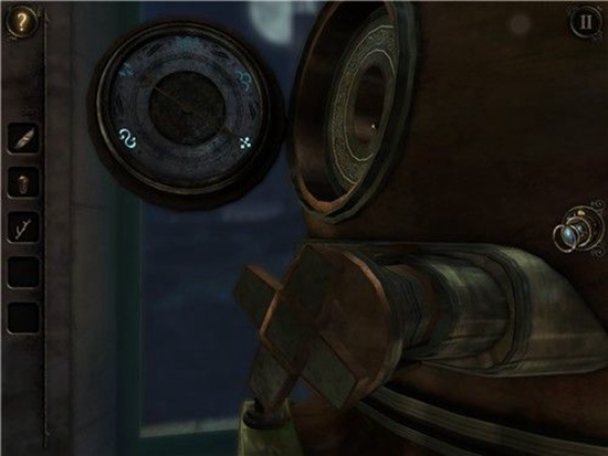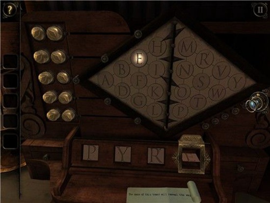 我们发现圆盘上的神秘字符中有几个和头盔下的铭牌上的字符一模一样。旋转旋钮把指针分别指向三个字符中,激活字符。