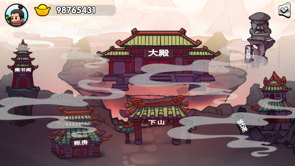 在本站下载该游戏的最新官方版,打开进入游戏大厅,这里有练功房、大殿、下山、账房和藏书阁。