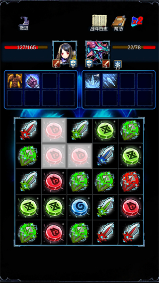 在战斗界面中,连接相同颜色或者形状的格子来进行消除。