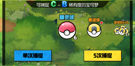 精灵球可以进行单次捕捉和5次捕捉,可以捕捉C~B稀有度的宝可梦