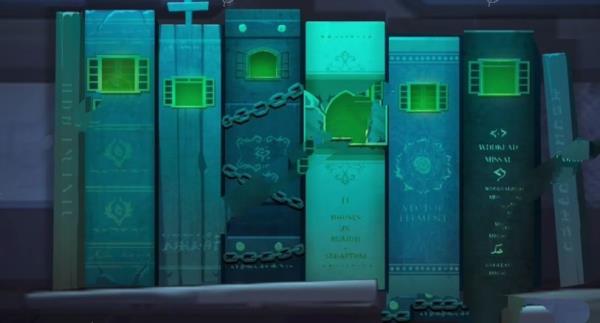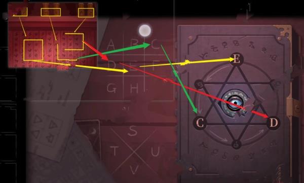 查看右边书,根据烛台符号连线得到的图案,找到对应的字母依次填在书上(书上的字母顺序有箭头指示),打开书记住代号和图案。