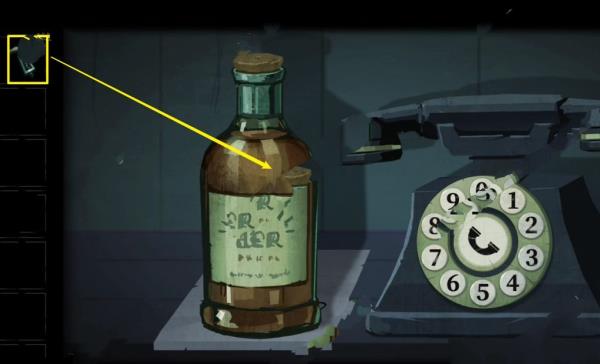 查看电话机,对玻璃瓶使用【开瓶器】获得【葡萄酒】,在下面的纸上看到酒精显色。