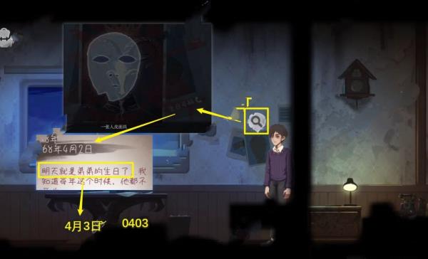 查看墙上的羊脸画,使用【葡萄酒】得到****线索,获得提示生日号码,在日记本中的线索中可以得出弟弟的生日是4月3日(日记日期4月2日,明天生日就是4月3日),对应号码0403。