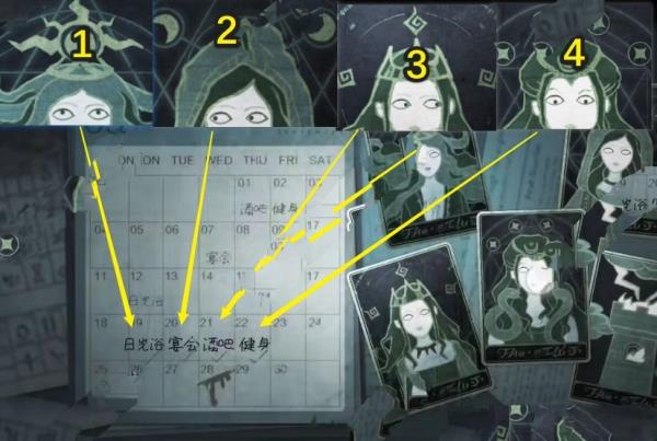 查看桌子,点击每张卡罗牌,记住每张牌最后眼睛的方向,根据卡牌头上图案的顺序多少进行排序,分别对应日历中“日光浴、宴会、酒吧、健身”。
