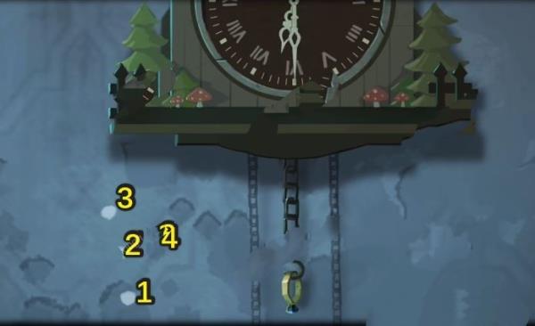 查看墙上的钟表,将【男士戒指】安装在铁链下面,通过摆动戒指调整钟表时间,将时间调整到6点30(戒指摆动上面的分针就会走动,向左走到头会向右移动,反之向左移动,通过调整戒指摆动的规律调整时间,如图对照墙上三个白点,按照顺序将摆钟摆至对应位置),在小鸟的嘴中获得【开瓶器】。