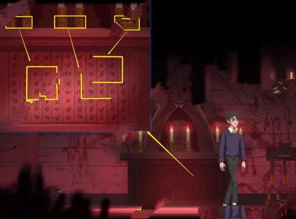 向左来到神案前,点亮蜡烛,查看下面的符号,对应三组烛台,将和每组烛台相同的符号连线,得到三个图案。