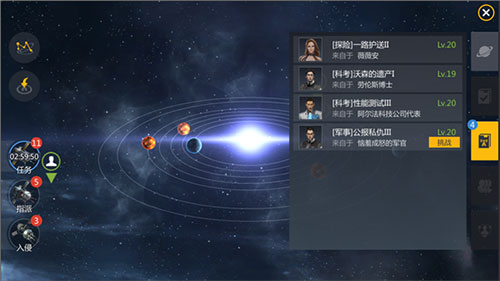 指挥官可以在任何星系内,在星图界面中使用任务探针,扫描星系中当前存在的星系任务。扫描到的星系任务将进入指挥官的可接任务列表,指挥官可以在列表中查看任务详情并选择是否接取任务。同时接取任务的数量没有限制。如果不满意星系任务,可以重新进行一次探针扫描,这将重新获取一批新的任务。