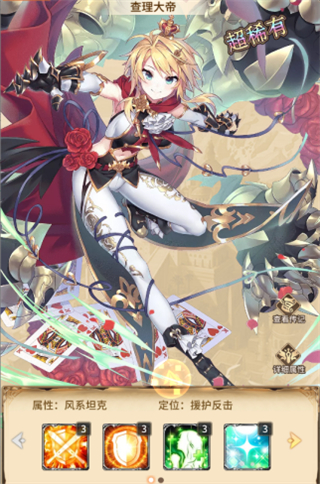 查理曼,职业风系坦克上阵该英雄后有援护、反击等效果,该英雄有4个技能,2个被动技能和2个主动技能,等级达到100级后均可激活所有技能。