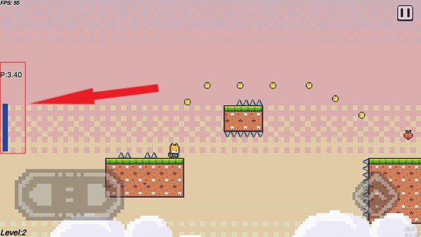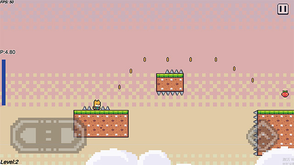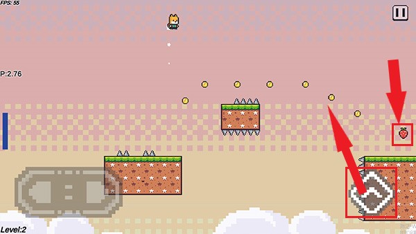 长按跳跃键可以喷气,让小狐狸飞起来,玩家可以控制好方向收集上方的金币,收集到草莓就可以通过关卡。