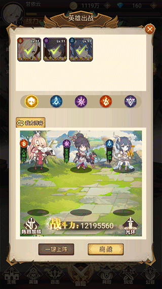 选择上阵英雄,苍蓝克赤炎,赤炎克紫耀,紫耀克苍蓝国,暗影伤害和被伤害都提升10%,根据属性来安排阵容可以带来更高的战力加成;