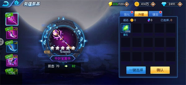 装备升星。消耗星石可提高装备属性,装备品质越高,消耗的星石越多,但属性提升也越多哦!