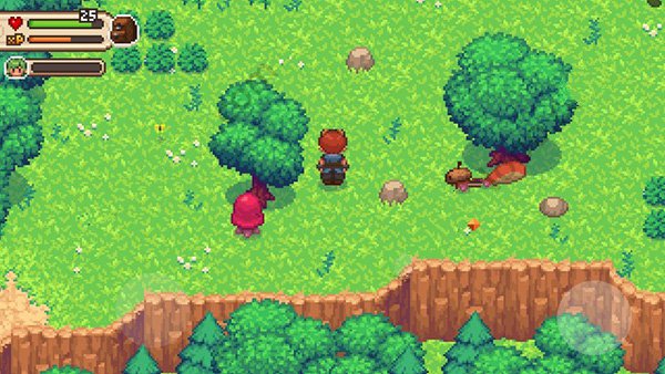 在我们没有武器的时候路上的灌木丛会挡住我们的去路,有武器的时候只需要点击攻击就可以击毁灌木丛,在击毁灌木丛后有几率掉落补血的红心和金币。在屏幕的左上角绿色条是我们的生命值,底下的黄色条是经验值,击杀怪物后可以获得大量经验升级。在森林中如果遇到宝箱的话一定要面对宝箱点击攻击键可以打开宝箱获得物品。在游戏中看到蓝色的光圈时一定要在上面站一下因为这是保存记录的,每当玩家战败后都可以再上一个地方复活。