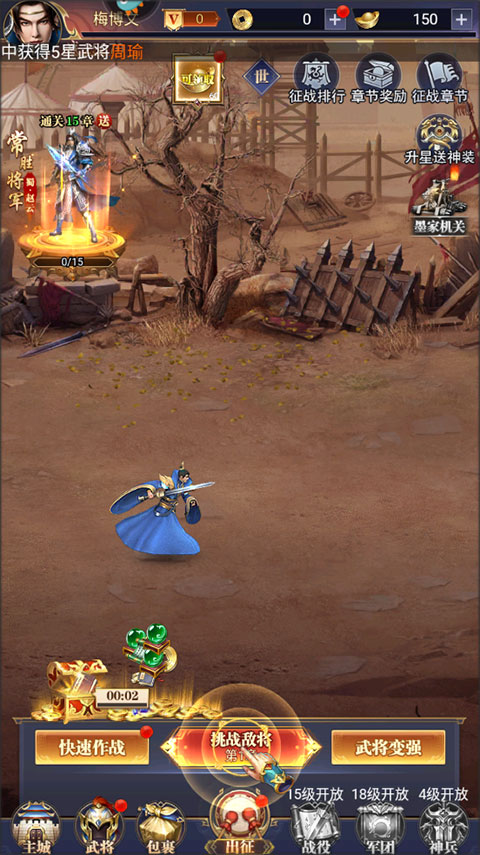 小提示:布阵时一般近战武将摆放在最前面,携带防御能力较强的刀兵或者负重能力较强的骑兵,远程武将靠后摆放,携带攻击速度较高的弓兵。
