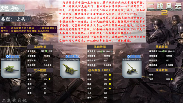 炮兵在中前期可谓是中流砥柱的作用,反坦克炮和榴弹炮更是属于必出军备,但是它龟爬一样的速度、1分钟的进入阵地时间等设定被很多玩家诟病,相比这样的“缺点”,在森林中所增加的攻击力显得过于微小。