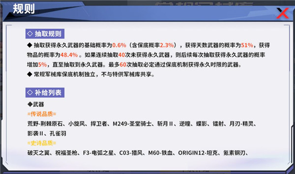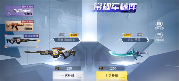 军械库分为特供军械库与常规军械库,两种军械库补给时所消耗的材料道具不同。参与补给均有概率获得永久武器。
