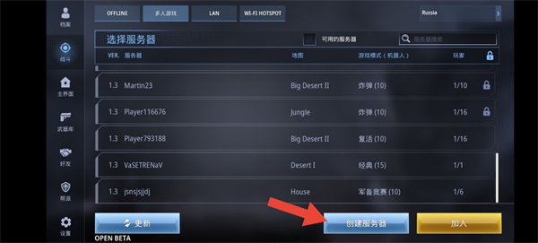 在战斗界面点击创建服务器选项。