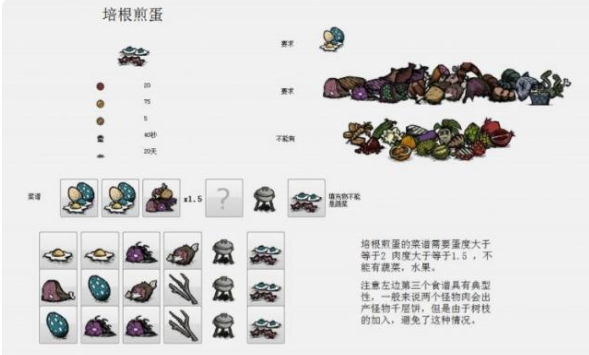 ②培根煎蛋:可以回20点血量,制作需要蛋度、肉度都>1.5,例如:2个蛋+1个怪物肉+1个小肉,或2个蛋+1个鱼+1个怪物肉。