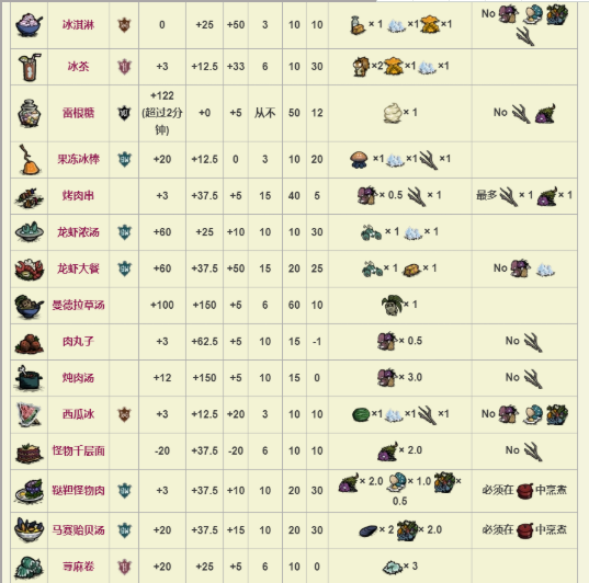 从第一幅图中,我们可以看到回血最高的分别是曼德拉草汤和火龙果派以及华夫饼。但是曼德拉草汤虽然回血回的多,原料却是太少了。一个地图上能有三个曼德拉草就已经不错了。所以火龙果派是当之无愧的第一,成本低廉,并且吃的时候不会有停顿动作。