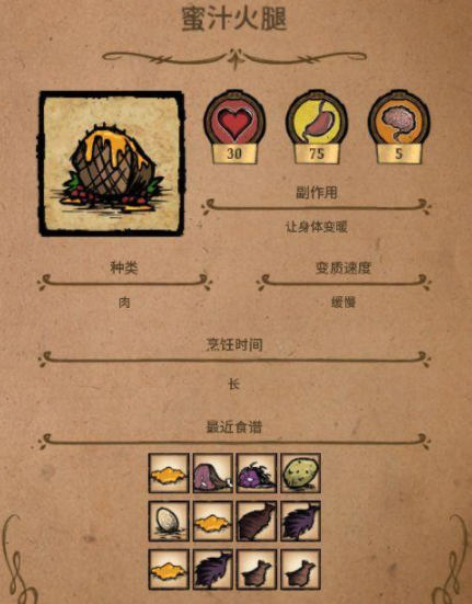 ③蜜汁火腿:可以回30血,想要制作必须要一个蜂蜜,例如:2个蜂蜜+2个大肉,或1个蜂蜜+1个冰+1个怪物肉+1个大肉。
