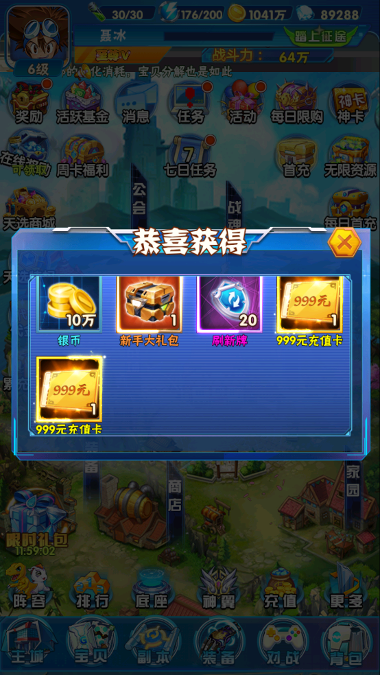 游戏上线送超丰富好礼,两张999元充值卡第二天即可启用。